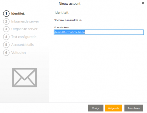 - Vul bij Uitgaande server email, bijvoorbeeld mail.firemultimedia.eu in. Vul bij Gebruikersnaam jouw volledige e-mailadres in en klik op Volgende.